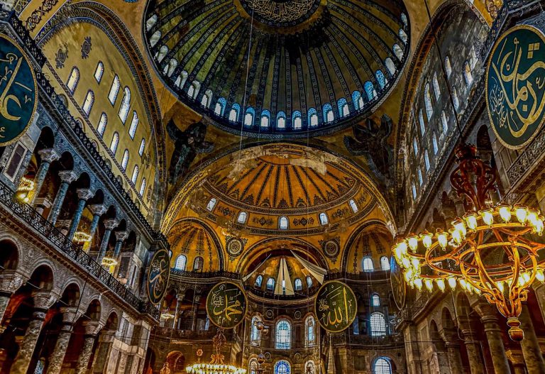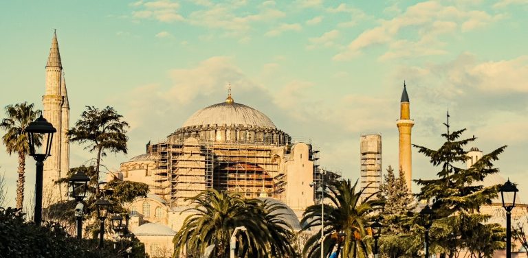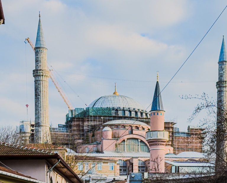 In a city replete with history, where each street corner seems to have a piece of beautiful historical architecture, there stands one site that towers above them all in stature and significance, the Hagia Sophia. The figure that looms large in the Istanbul skyline is technically the “third Hagia Sophia,” as the previous two Hagia Sophias had been destroyed when the city was sacked. The Hagia Sophia that can be seen today was completed in 537 AD under the orders of Emperor Justinian I. He would appoint Isidore of Miletus and Anthemius of Tralles to head up the construction of the larger, grander new Magna Ekklesia. Justinian wanted the church to be a reflection of the empire itself, so he had the building constructed with materials from across the Empire; Marble pillars would be crafted from Turkish marble, the bricks for the walls and floors were brought from North Africa, and the grand entrance doors were taken from Greek temples and repurposed for the grand church. The scale of the church is massive, and it has required upkeep and renovations throughout the centuries. Indeed, the ages have not been kind to the old gal, as conquest and imperial expansion put her in the hands of the Latin West and the Ottomans for much of her history. However many conquerors she saw, every leader who laid eyes on such a marvelous architectural feat saw it as a disservice to let this grand religious spectacle come into disrepair. Currently, the Hagia Sophia operates as a mosque, as it had during Ottoman control, and was under construction when we visited.